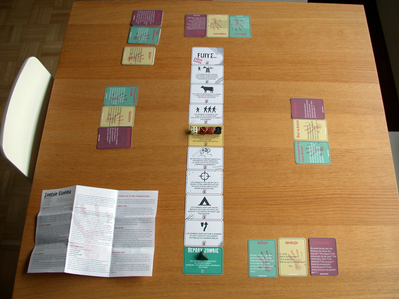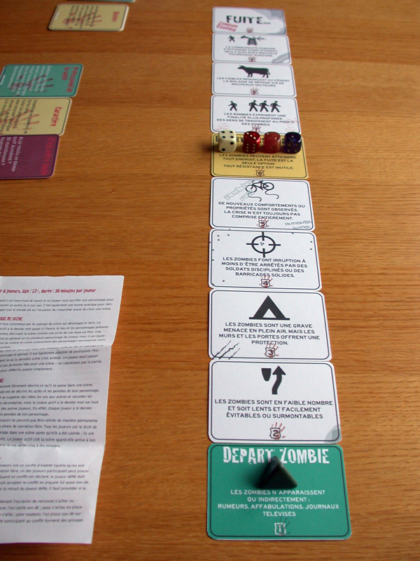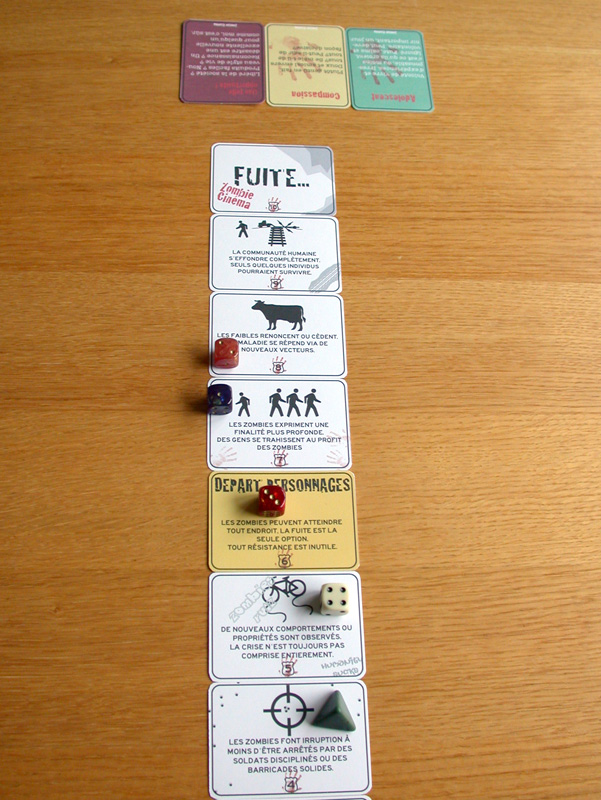 Pour répondre à ta question Christoph, j'ai pris ce que j'avais sous la main pour les photos. Mais les dés étant de couleur différentes ils remplacent les pions que j'avais la flemme de chercher dans un autre jeu. Pour un futur test je pense utiliser des pions ou des jetons.